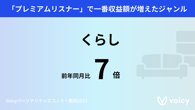 2022年にチャンネル数や総再生時間が飛躍した(※1)ジャンルだった“くらし”は引き続き堅調な人気で、声の月額課金機能「プレミアムリスナー」においても一番収益額が増え、前年同月比7倍になったことがわかりました。これは、声をきっかけにコミュニティが生まれ、広がっていることが表れています。