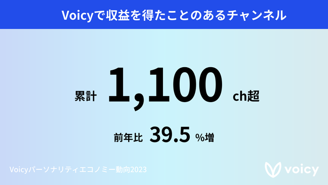 Voicyでこれまで収益化を実現したことのあるチャンネル数は前年に比べ39.5%増え、累計1,100チャンネルを突破しました。さらに、過去1年以内に放送をしたことのあるチャンネルを対象すると、6割のチャンネルが収益化を実現していることがわかりました。