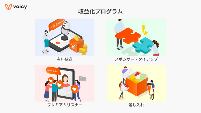 Voicyの収益化プログラムには、「有料放送」、「プレミアムリスナー」、「スポンサー・タイアップ」、「差し入れ」と大きく4つのメニューがあります。