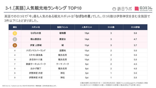 口コミ数に着目すると、伊勢神宮などの人気観光スポットにおいても、調査期間中の外国語口コミは10件未満であったことが分かりました。