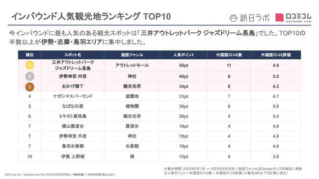 今インバウンドに最も人気のある観光スポットは「三井アウトレットパーク ジャズドリーム長島」でした。TOP10の半数以上が伊勢・志摩・鳥羽エリアに集中しました。