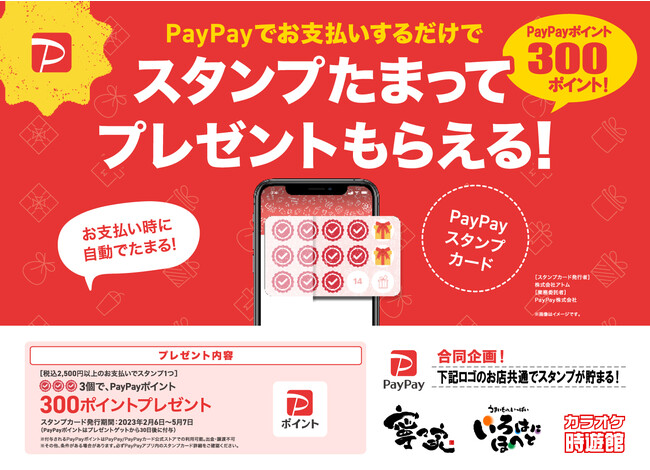 コロワイドグループの株式会社アトム(本社:神奈川県横浜市、代表取締役社長:山角豪)は、2023年2月6日(月)~2023年5月7日(日)の期間中、居酒屋カラオケの対象店舗で、「PayPayスタンプカード」を実施します。期間中に対象店舗で店内飲食またはお持ち帰り商品2,500円(税込)以上をPayPayでお支払いいただくと1決済ごと1スタンプ付与、3スタンプでPayPayポイント300ポイントをプレゼントいたします。同期間実施の「PayPayクーポン」と併せまして、ぜひこの機会にお得にお食事をお楽しみください。
