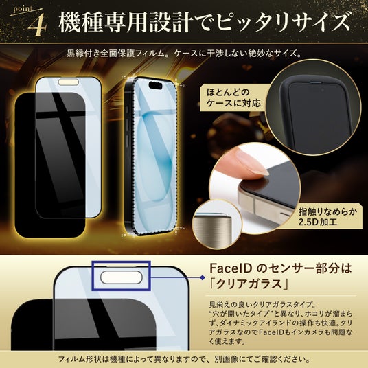 機種専用の黒縁付き全面保護フィルム。ケースに干渉しない絶妙なサイズ。