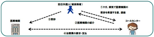 ご利用方法:1.医療機関での治療を希望する場合、コールセンターへ訪日外国人(被保険者)の方