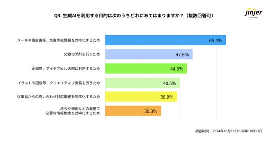 生成AIを利用する目的の最多意見は「文書作成業務を効率化するため」。