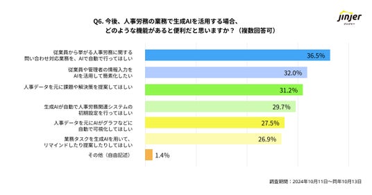 人事労務システムにおける生成AIに関する機能で、今後あると嬉しい機能は「人事労務に関する問い合わせ対応業務の自動化機能」。