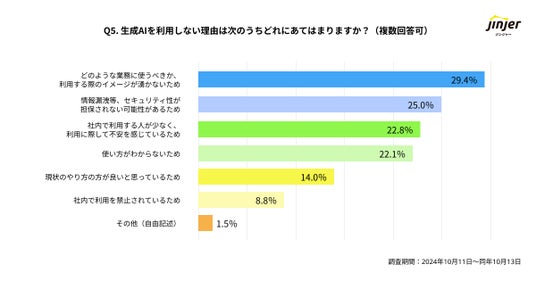 生成AIを利用していない人事担当者を対象に、利用しない理由を聞いたところ、最も多かった意見は「どのような業務に使うべきか、利用するイメージが湧かないため(29.4%)」でした。次いで「情報漏洩等、セキュリティ性が担保されない可能性があるため(25%)」、「社内で利用する人が少なく、利用に際して不安を感じているため(22.8%)」、「使い方がわからないため(22.1%)」等の回答が多くあげられました。