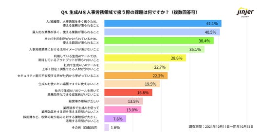 人事労務領域で生成AIを扱う際の課題を聞いたところ、最も多い意見は「人/組織等、人事情報を多く扱うため、使える業務が限られる(41.1%)」でした。他にも、「属人的な業務が多く、使える業務が限られる(40.5%)」、「社内で利用制限がかけられているため、使える業務が限られる(38.4%)」、「人事労務業務における活用イメージが湧かない(35.1%)」という意見が多くあげられました。