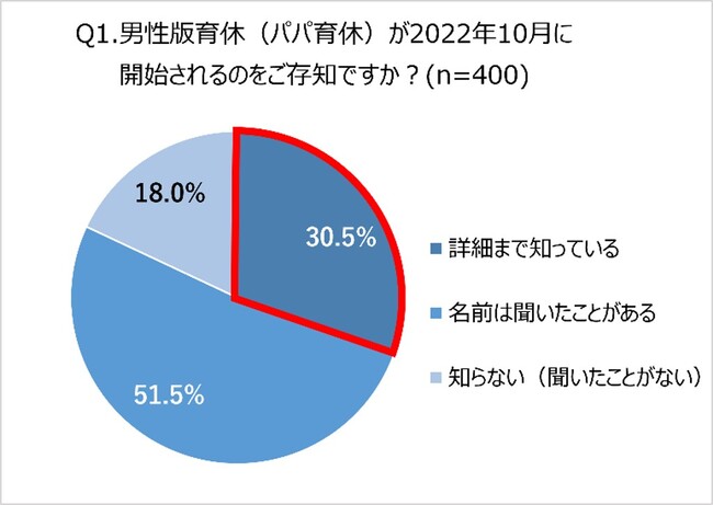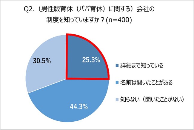 経験者・予定者であっても、育休の法改正を詳細まで知っていると回答したのは30.5%と決して高くないことが分かりました(図Q1)。また、男性版育休(パパ育休)に関する会社の制度を知っていますか?という問いに対しても、詳細まで知っているのは25.3%と、3割未満の結果となりました(図Q2)。