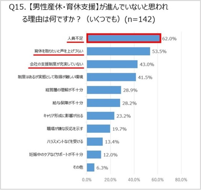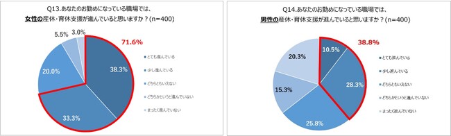 職場の女性の育休支援が進んでいると回答したのは7割以上。一方で、男性育休支援が進んでいると回答したのは約4割。男性の育休支援が不十分と回答した理由は、「人員不足」、「育休を取りたいと声を上げづらい」 、「会社の支援制度が充実していない」。