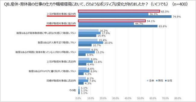 一方、職場復帰後には男性の約5割が「育休取得者に対する理解が生まれた」と回答また、半数以上が「上司や同僚が取得対象者に協力的」と回答。