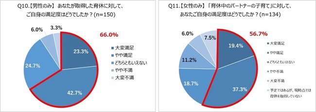 一方、職場復帰後には男性の約5割が「育休取得者に対する理解が生まれた」と回答。男性育休に対する満足度は、取得者本人の6割以上、パートナーの約6割が、高い満足度を示した。