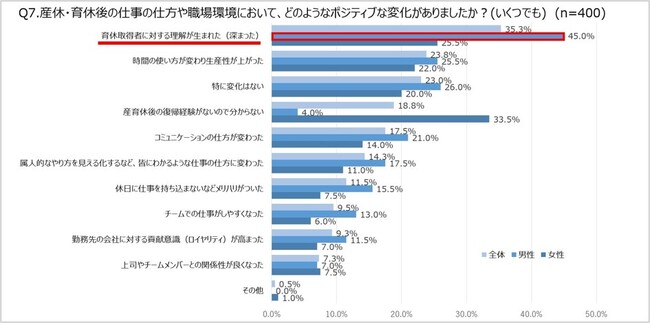 休取得前の不安は5割近い結果となりましたが、実際に育休後の職場復帰では「育休取得者に対する理解が生まれた」と回答したのが全体の35.3%、特に男性は45.0%という結果となりました(図Q7)。