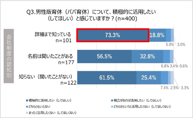 一方、利用意向について聞いたところ、男性版育休(パパ育休)に関する自社制度について、「詳細まで把握している」と回答した人の積極的な利用意向が73.3%と最も高く、会社の育休制度が整っており、なおかつ内容が周知されていることが重要なカギであることが分かります(図Q3)。
