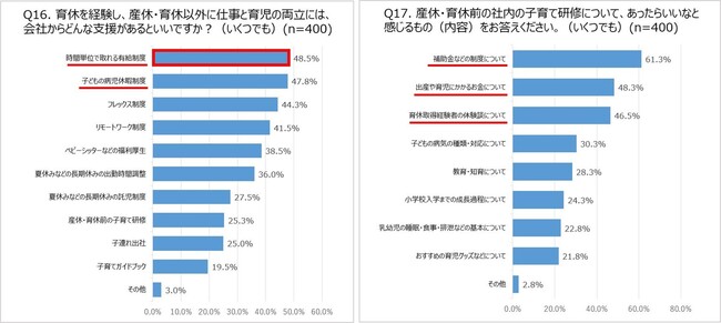 また、産休・育休前の社内の子育て研修についてあったらいいなと感じるものについては、「補助金などの制度について(61.3%)」、「出産や育児にかかるお金について(48.3%)」と金銭的な情報や、「育休取得経験者の体験談について(46.5%)」という経験者の生の声も求められていることが分かりました(図Q17)。