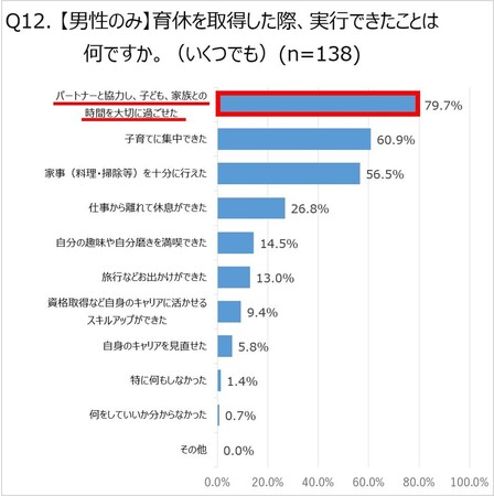 育休取得者は男女ともに満足度が高く、約6割の結果に(図Q10,11)。中でも男性は「パートナーと協力し、子ども・家族との時間を大切に過ごせた」と回答する人が79.7%にも上りました。その他、「子育てに集中できた(60.9%)」、「家事(料理・掃除等)を十分に行えた(56.5%)」と本来の育休の目的を果たせている人が多く見受けられました。また、「資格取得など自身のキャリアに活きるスキルアップができた(9.4%)」、「自身のキャリアを見直せた(5.8%)」と一定数、仕事への意識・新しい挑戦のきっかけにもなることがうかがえました(図Q12)。