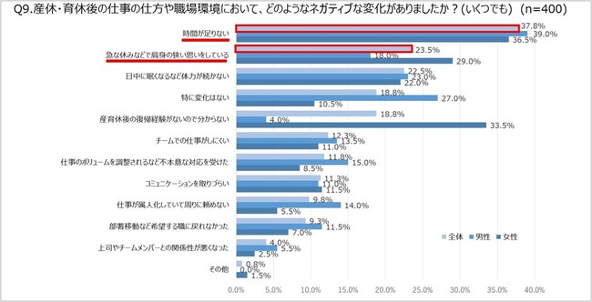 育休の復帰後ネガティブに感じた要素でも、「時間が足りない(37.8%)」の次に、「急な休みなどで肩身の狭い思いをしている(23.5%)」と続くことから、復帰後も一定数の人が子育てにおける職場の課題を感じていることが明らかになりました(図Q9)。