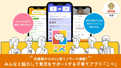 「こぺ」は、子どものココロとカラダの健やかな成長のために、子育てをするパートナー間において、すれ違いを生むさまざまな原因を解消し、よりよい子育て環境づくりを支援する目的で、2019 年 2月より無償提供を開始した子育てアプリです。11月より、田中俊之先生による「男性と育児」についての記事や、医師監修による赤ちゃんの睡眠サポートプログラム機能も搭載。第16回キッズデザイン賞受賞。