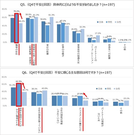 育休取得への不安を聞いたところ、実に49.3%が「不安」と回答しました(図Q4)。不安に感じる内容として、「職場の反応(58.9%)」、「復帰後の仕事への影響(配置転換、昇進等)(58.9%)」という回答が多く、職場の反応については男性の70.2%が不安に感じていることが分かりました(図Q5)。男女ともの理由としては、「育休を取得する人が少ない(51.3%)」、「会社の制度が整っていない(38.1%)」と感じる人が多く、制度があっても利用しづらい実態や、仕組み自体が整っていないという課題が浮き彫りとなりました。(図Q6)。 また、男性はハラスメントや嫌がらせに対し不安を抱く割合が高く、男性の育休取得に対する会社の理解や、取得しやすい社内の雰囲気醸成が重要であるとうかがえます(図Q6)。