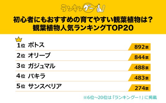 ランキングー!では初心者でも育てやすい観葉植物をピックアップし、人気ランキングを調査。全年代の男女(性別回答しないを含む)7,579名にアンケートを行い、TOP20を決定しました。ここではTOP5をご紹介します。