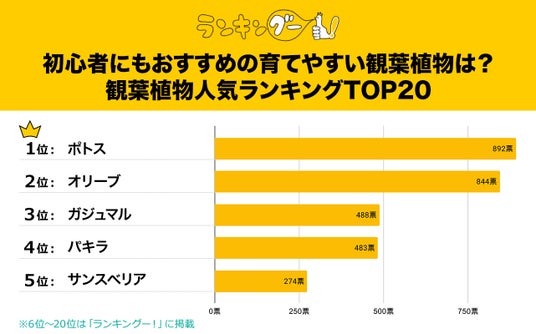 調査方法:株式会社CMサイトがインターネットリサーチした<初心者にもおすすめの育てやすい観葉植物は?観葉植物人気ランキングTOP20>のアンケート結果を集計。