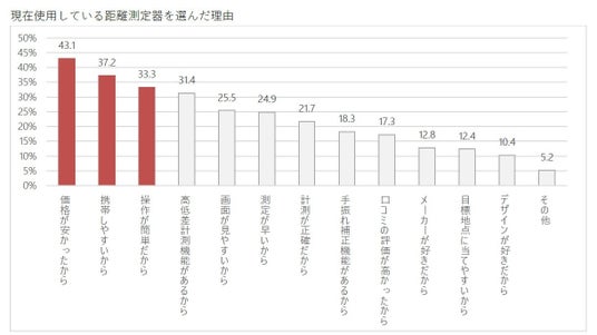現在使用している距離測定器を選んだ理由として最も多かったのは「価格が安かったから」(43.1%)。「携帯しやすいから」(37.2%)、「操作が簡単だから」(33.3%)と続きました。