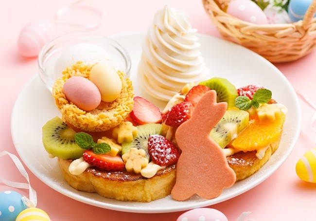 春のお祭りイースター(キリスト教における復活祭)に欠かせない“たまごとうさぎ”をモチーフにした特別メニューが今年も登場。フレンチトーストの上に、ディプロマットクリームと4種のフルーツをトッピングし、カラフルに仕上げました!お店で一枚一枚焼き上げたうさぎ型のクッキーと、2色のチョコタマゴがのった鳥の巣を飾った楽しい一皿です。
