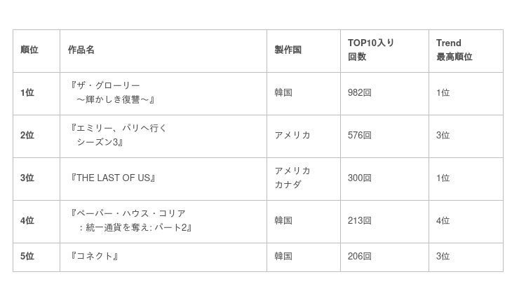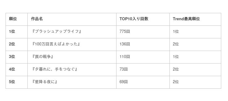 ※TOP10入り回数が同率の場合は、Trend最高順位が高い作品が上位となります。