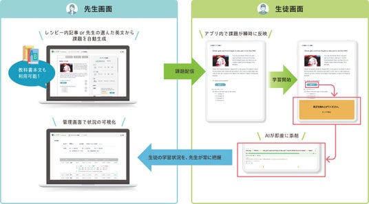 『レシピー for School』内のさまざまなニュース記事や先生の選んだ文章を入力するだけで、授業や宿題に活用できる単語や内容理解の問題、ライティング・スピーキングの問題をAIが自動で生成します。答案の採点やフィードバックもAIが行うため、問題作成から採点、生徒の成績管理までがアプリ内で完結します。