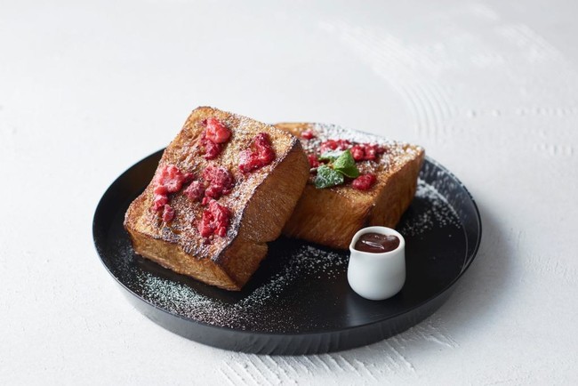GODIVA caféオリジナルのカカオミルクに浸したブリオッシュを香ばしく焼き上げ、甘酸っぱいフランボワーズを添えました。お好みでチョコレートソースをかけてお召し上がりください。