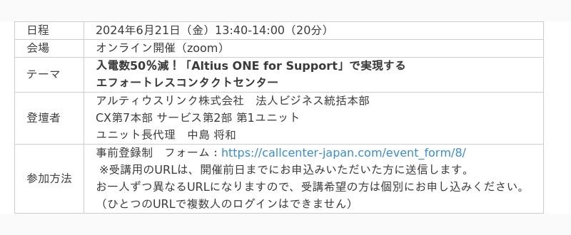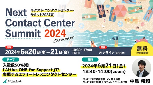 アルティウスリンク株式会社(所在地:東京都新宿区、代表取締役社長:網野 孝、以下 アルティウスリンク)は、コンタクトセンター/CS組織のIT活用と人財マネジメントのヒントを導く「ネクスト・コンタクトセンター・サミット2024夏」に協賛し、Day2:6月21日(金)の「令和のCX戦略」をテーマにしたソリューションセッションに登壇いたします。
