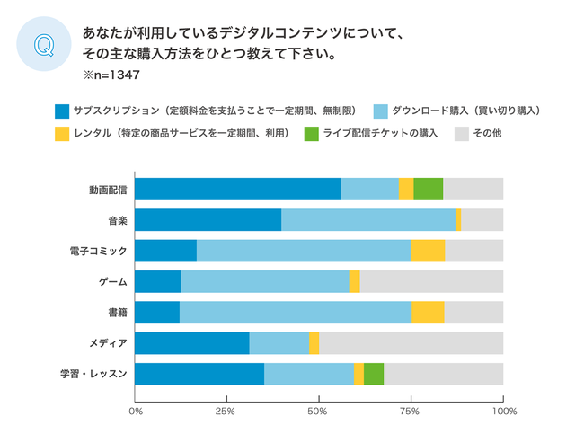 ◆「動画配信」ではサブスクリプションが浸透、「電子コミック」や「書籍」はダウンロード購入が多数派