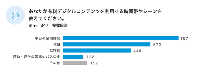 デジタルコンテンツを利用するのは「平日の余暇時間」や「休日」が主流となっています。「通勤・通学の電車やバスの中」で利用する人も少数派ですがいるようです。