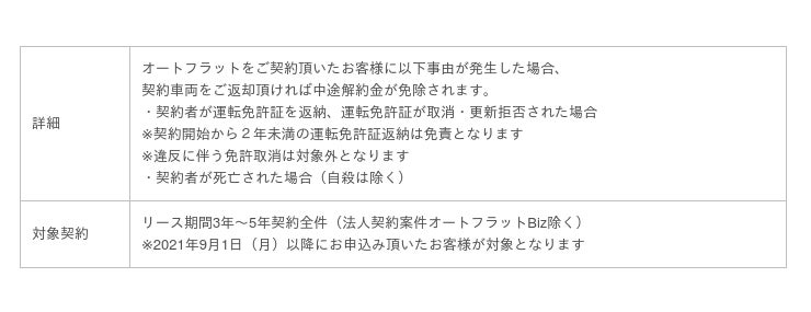 当社は、多様化するクルマの利用ニーズに応えるため、2015年からマイカーリース事業として「オートフラット」をスタートしました。「オートフラット」は、契約期間中に支払う月額料金の中に「車両代」「税金」「メンテナンス費用」が全て含まれる定額制マイカーリースです。このたび、ご契約者様の安心感向上を目的に、運転免許返納や死亡時に中途解約金を免除する「あんしんキャンセルサポート」を新たに導入します。高齢化社会が進展する中、新サービスの導入により、免許返納等の事態が発生した場合に中途解約金が免除されますので、安心してオートフラットをご契約いただけます。