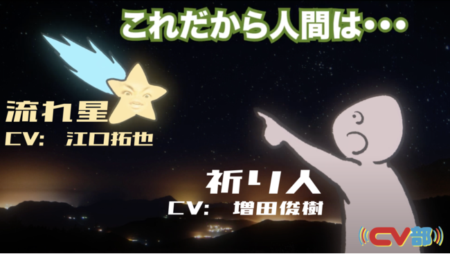 コンテンツスタジオ CHOCOLATE Inc. (本社:東京都渋谷区、代表取締役:渡辺裕介)は、本日2月4日に、身近にある「アレ」に対して、勝手に人格とキャラボイスをあてる“疑人格化”プロジェクトでチャンネル登録者数20万人を突破したYouTubeチャンネル・CV部にて、人気シリーズ「転生ガチャ~転生したら幸せになれると思ってたら大間違いだった件~」第2部の開始と、あわせて最新作「【CV:江口拓也、増田俊樹】流れ星に転生しました」を公開したことをお知らせいたします。本作では、これまで時限爆弾や流しそうめんマシーンなどさまざまなモノに転生し続け、今回は「流れ星」に転生した主人公を江口拓也が、突然の流れ星に願い事をしようと奮闘する青年を増田俊樹がアテレコ。流れ星に転生した人と、その流れ星に願いを込める人のヒューマンドラマを描いています。