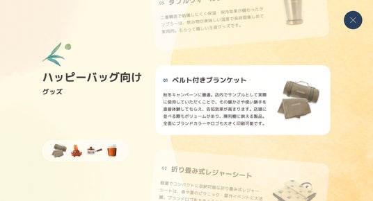 福袋やキッズセット、店舗・EC販売用、商品ベタ付けなど、年間通じて多様なキャンペーン企画・グッズ制作をしている飲食業界向けに、アイディア事例をまとめました。店舗ロゴをプリントしたエコバッグやミニタオル、待ち時間に親子で遊べるおもちゃなど、トレンドを抑えた情報が網羅されています。さらに各アイテムをクリックすると、グッズの詳細ポイントが書かれたポップアップが出現。こだわり抜いたグッズ制作でキャンペーンを盛り上げる後押しをします。