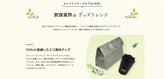 さまざまな企業のものづくりに携わるアイグッズが注目する、飲食業界のトレンド情報を掲載。自社で出た食糧廃棄物を再利用した、環境に優しいエコなアイテム制作など、注目情報を網羅しています。