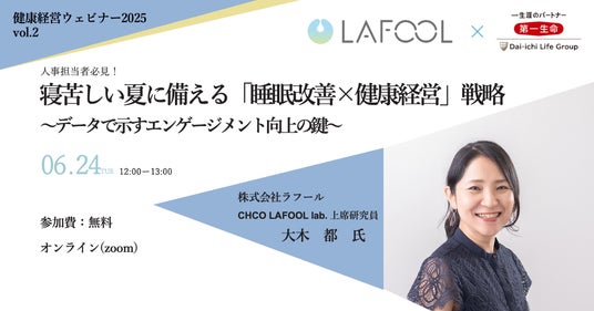 人的資本/ウェルビーイング経営支援の株式会社ラフール(本社:東京都中央区、代表取締役社長:結木啓太、以下「ラフール」)は、第一生命保険株式会社(代表取締役社長:隅野俊亮、以下「第一生命」)と共催で、「寝苦しい夏に備える”睡眠改善×健康経営”」戦略 ~データで示すエンゲージメント向上の鍵 ~」をテーマとしたセミナーを、6月24日(火)に開催します。