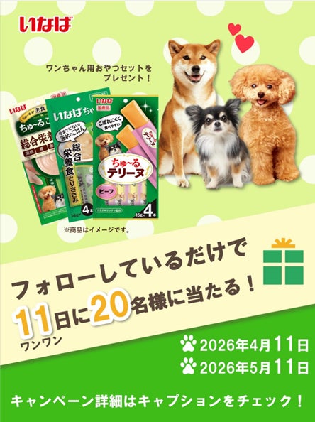 いなばペットフード株式会社(いなば食品グループ 本社:静岡県静岡市清水区由比 会長:稲葉優子)は、2026年4月11日(土)23:59まで、弊社Instagram公式アカウントにて「ワンワンキャンペーン」を開催中です。