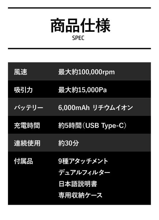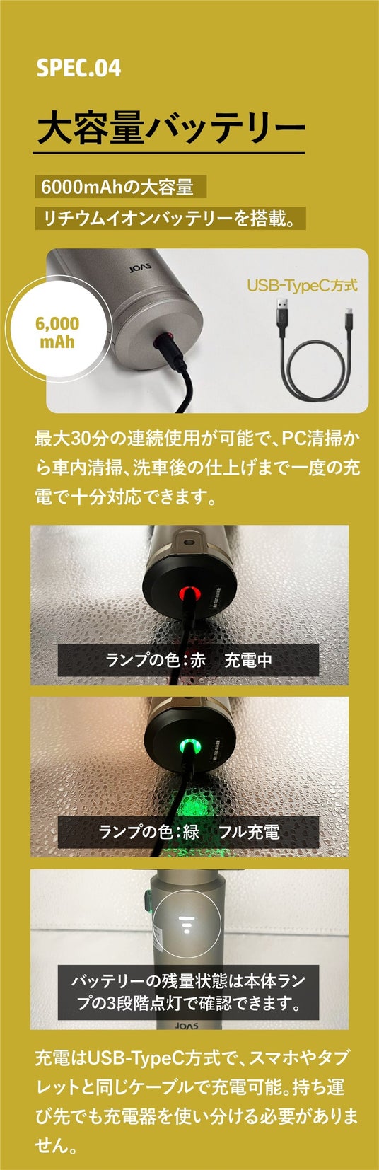 最大30分の連続使用が可能で、PC周りの清掃から車内清掃、洗車後の仕上げまで一度の充電で対応できます。充電はUSB Type-C方式のため、スマホやタブレットと同じケーブルで充電でき、持ち運び先でも充電器を使い分ける必要がありません。