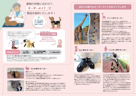 株式会社anifullでは既製品のみならず、オーダーメイド製作での対応も行っております。最近では犬や猫などのペットに限らず、動物園にいるキリンや水族館のペンギンなど様々な動物に向けたサポーター製作のご相談をいただく機会が増えてまいりました。専門のスタッフがヒアリングを行い、それぞれの動物の体形や症状に合わせたサポーターの製作が可能です。