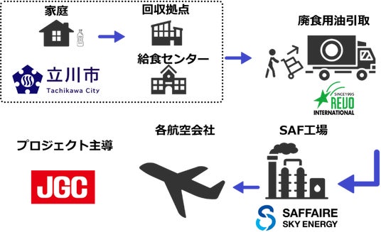 今回の協定に基づき、立川市が回収した廃食用油をレボインターナショナルが収集し、国内初のSAF大規模生産を行うSAFFAIRE SKY ENERGYのプラント(コスモ石油堺製油所内、2024年12月完工)へ運び、国産SAFの原料として資源化します。