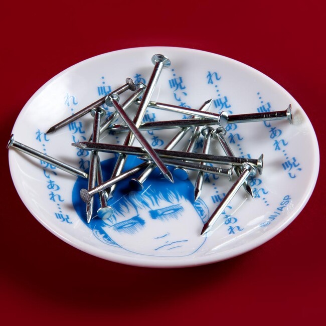呪いを振り撒く双一に彼のマストアイテムのひとつである釘があしらわれた凶悪さ漂う商品。どこか憎めない双一の魅力と象徴的なアイテムが調和する。