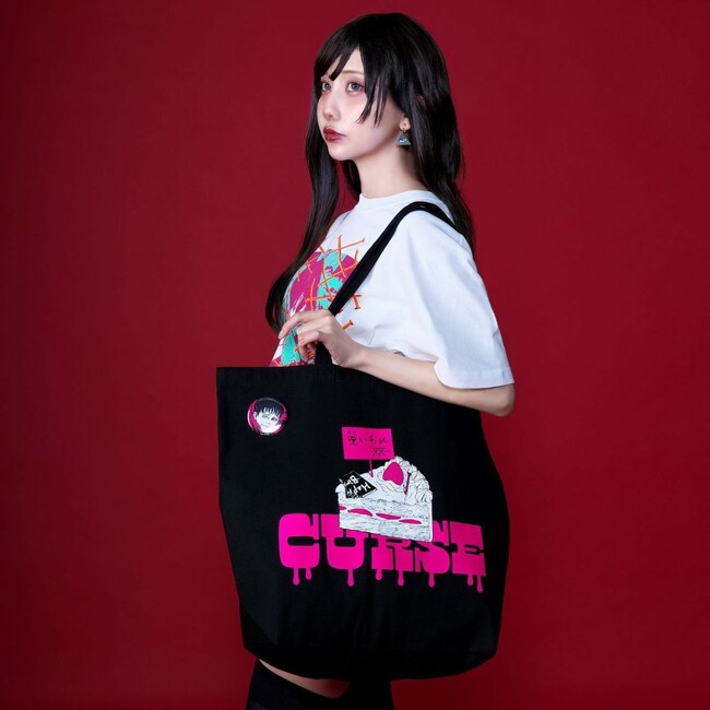 実用性の高い大容量のトートバックにプリントされたケーキとポップなCURSE(呪い)の文字。ワンポイントで双一の缶バッジもついた呪われしアイテムでお買いものに出かけてみてはいかがだろう。