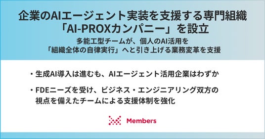 DX現場支援で顧客と共に社会変革をリードする株式会社メンバーズ(本社:東京都中央区、代表取締役社長:高野 明彦、東証プライム:2130、以下「メンバーズ」)は、企業のAIエージェント実装を支援する専門組織「AI-PROXカンパニー(エーアイプロックスカンパニー)」を2026年4月1日付で設立したことをお知らせします。