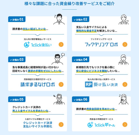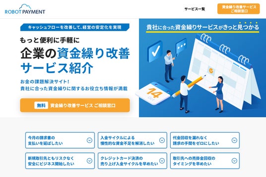 株式会社ROBOT PAYMENT(本社:東京都渋谷区、代表取締役:清久 健也、以下 当社)は、当社が提供する資金繰りサービスをまとめて提案する「資金繰り相談窓口サイト」を公開したことをお知らせします。本サイトを通じて資金繰りを改善し、中小企業の生産性向上と事業成長に貢献してまいります。