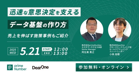 株式会社NTTドコモのマーケティング分野における新規事業型子会社である株式会社DearOne(本社:東京都港区、代表取締役:河野 恭久、以下:DearOne)は迅速な意思決定を支えるデータ基盤の作り方、売上を伸ばす施策事例を紹介するセミナーを2025年5月21日(水)に株式会社primeNumber(本社:東京都品川区 代表取締役CEO:田邊 雄樹、以下:primeNumber)と共催で開催いたします。