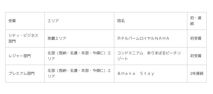 「楽天トラベルアワード2015」は、取扱額やお客さまの評価などを総合的に評価し決定する「総合部門」と、各項目で飛躍的な実績をあげた宿を表彰する「個別部門」の2部門にて発表いたします。沖縄地区では、以下の23宿が受賞し、そのうち9宿が初受賞となりました。発表内容は以下の通りです。