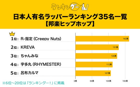 調査方法:株式会社CMサイトがインターネットリサーチした<日本人有名ラッパーランキング35名一覧【邦楽ヒップホップ】>のアンケート結果を集計。