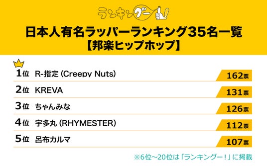 2位は日本のHIPHOPシーンを牽引する人気ラッパー、KREVAさん。2位と5票差で3位には同世代を虜にする女性ラッパー、ちゃんみなさんがランクイン。続く4位はHIPHOPグループ「RHYMESTER(ライムスター)」の宇多丸さん。4位とまたもや5票差で5位にランクインしたのは、ACジャパンのCMでも注目を集めた呂布カルマさんでした。
